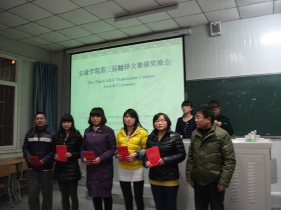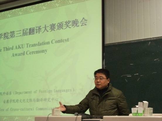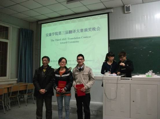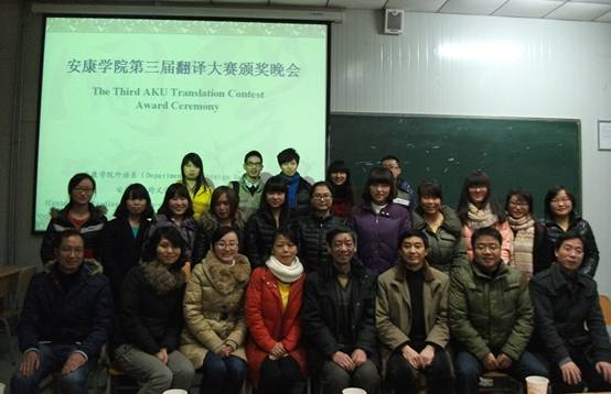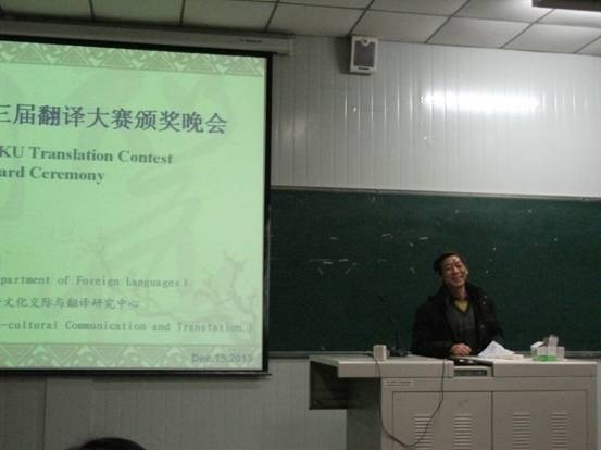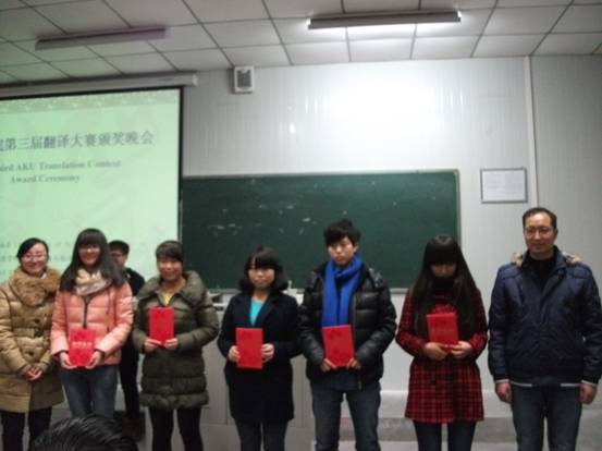 2013年12月19日晚,yL23411永利官网登录第三届翻译大赛颁奖仪式在江南校区顺利举行。莅临本次大赛颁奖仪式的嘉宾有永利官网特聘教授邹先道教授,外语系李延福书记、“五联共建”支部学校组织部副处级组织员于咏梅老师、大学英语教学部主任李继平,外语系副主任张哲华以及翻译课程群任课教师。