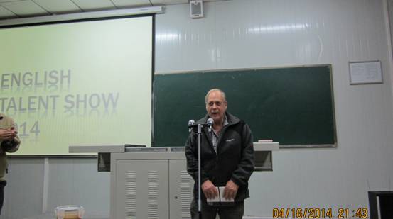 4月16日晚7点,一年一度的“yL23411永利官网登录大学生英语才艺大赛”总决赛在1018教室隆重举行,永利官网新西兰籍教师Raymond John Dennison,以及刘燕、杜恒、周玫、袁国、任森龙等老师担当评委,永利官网大学英语教学部主任李继平老师到会颁奖并讲话。