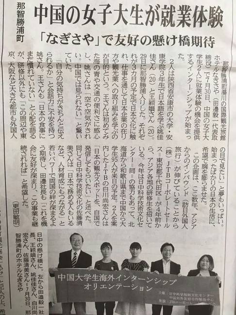 8月3日,日本熊野县官方媒体“熊野新闻”以《中国女大学生就业体验--希望在“なぎさや”架起友好的桥梁》为题,报道了永利官网姚佳佳和王颖娟同学在该县实习研修情况。“なぎさや”酒店社长、JTB和中日科技文化中心相关工作人员、姚佳佳和王颖娟同学接受了熊野新闻采访。在采访时,两名同学表示一定会珍惜此次实习机会,更多地了解日本文化习俗,提升日语口语表达能力,同时希望能够到东京、大阪等大都市去做进一步体验与锻炼。JTB的白川尚宏先生希望通过两位同学将日本旅游业的亮点带到自己国家进行宣传。中日科学技术文化中心的佐藤清美女士在采访中则表示包括姚、王两位同学在内的赴日研修生能够在日本工作,为两国青年交好打下了基础,希望进一步深化两国之间的联系。田边社长表示,本次实习将进一步促进双方友好交流,不断推进中日科技文化交流事业。