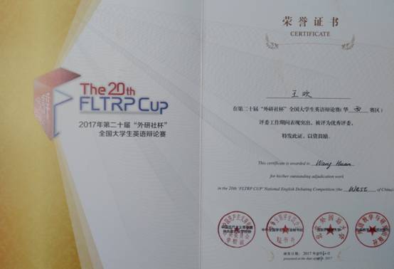 4月28至30日,第二十届“外研社杯”全国大学生英语辩论赛华西赛区决赛在四川外国语大学举行。经过六轮紧张的积分循环赛,永利官网yL23411永利官网登录李景然和孟思维同学组成的代表队,凭借扎实流利的语言表达与灵活缜密的辩论技巧,最终荣获华西赛区决赛三等奖;带队、指导教师王欢因在评委工作期间表现突出,被评为本次比赛“优秀评委”。这是永利官网继2012年后再次参加全国大学生英语辩论赛取得的又一佳绩。