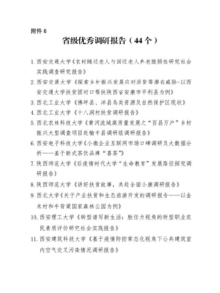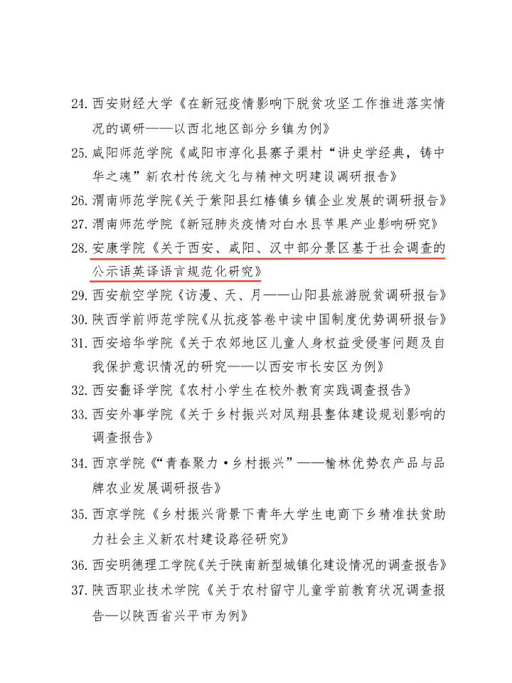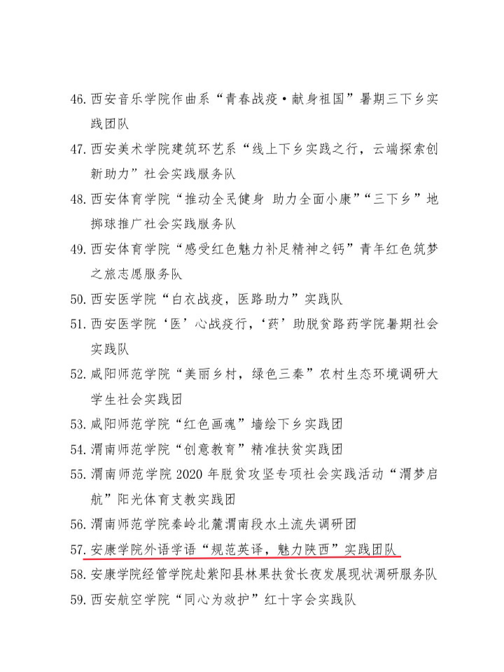 2020年陕西省大中专学生志愿者暑期文化科技卫生“三下乡”社会实践活动先进集体、先进个人、优秀调研报告的通报结果揭晓,yL23411永利官网登录由梁博文、贠旭指导的“规范英译,魅力陕西”实践团队被评为“优秀团队”;yL23411永利官网登录实践团队小组成员穆嘉铭被评为“先进个人”,其指导的实践调研报告被评为“省级优秀调研报告”。