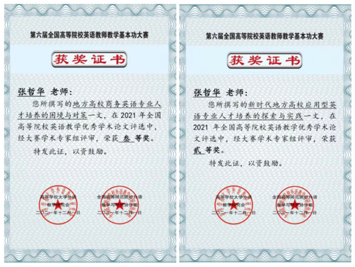 近日,2021年全国高等院校英语教学优秀学术论文评选结果揭晓,永利官网院长张哲华撰写提交的论文《新时代地方高校应用型英语专业人才培养的探索与实践》荣获二等奖,《地方高校商务英语专业人才培养的困境与对策》荣获三等奖。