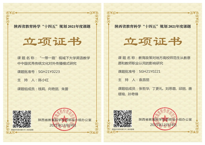 目前,陕西省教育科学“十四五”规划2021年度课题立项评审工作已经结束,经资格审核、专家评审、立项公示、省规划办最终审定等环节,永利官网共有2个课题获得立项。陈小红老师的《“一带一路”视域下大学英语教学中中国优秀传统文化对外传播模式研究》和袁昌丽老师的《教育政策对地方高校师范生从教意愿和教师职业认同的影响研究》被立项为省级一般课题。
