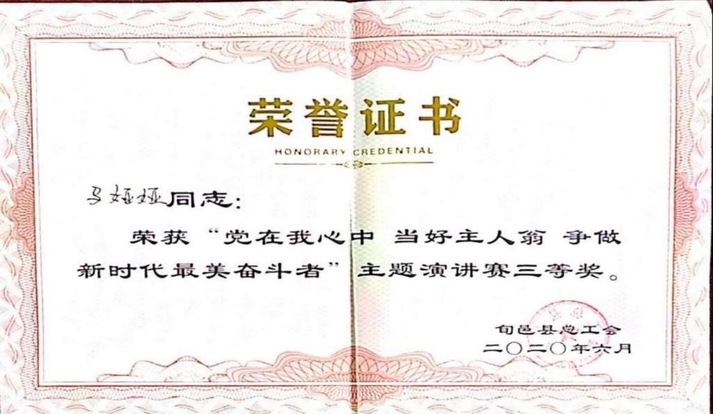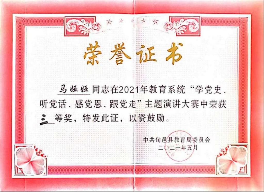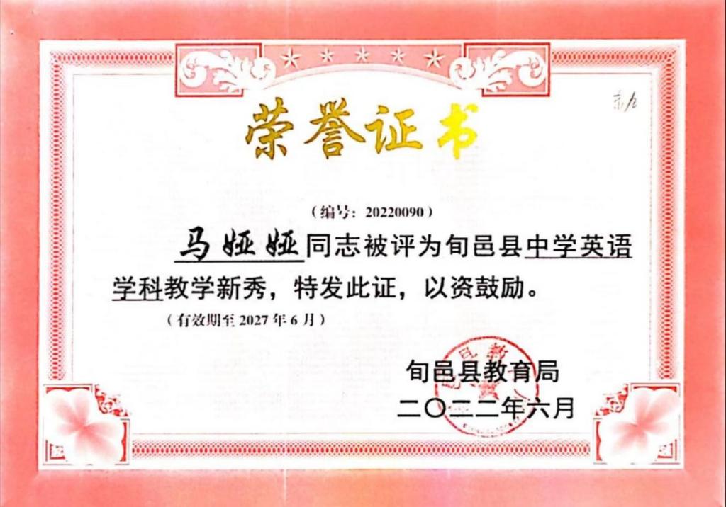 我热爱我的家乡,我亦热爱农村教育事业,而我热爱的也给予了我肯定。从业期间,我参与课题《如何在英语课堂教学中进行学困生转化》并获得市级立项;参与陕西省“奋斗陕西”奋斗人物录制活动;在旬邑县“青华杯”教学大赛中荣获“教学能手”称号;在旬邑县“2022年教学能手大赛”活动中荣获教坛新秀称号;在旬邑县“听党话,感党恩,跟党走”主题演讲大赛中荣获二等奖;在旬邑县“弘扬好家风,文明新时代”主题演讲中荣获三等奖;在旬邑县总工会“党在我心中,当好主人翁,争做新时代最美奋斗者”主题演讲赛中荣获三等奖;在旬邑县教育系统“学党史,听党话,感党恩,跟党走”主题演讲大赛中荣获三等奖;在太村镇赤道九年制寄宿学校“弘扬爱国奋斗精神,建国立业新时代”师德师风演讲比赛中荣获一等奖;在太村镇赤道九年制寄宿学校“弘扬好家风,文明新时代”演讲比赛中荣获一等奖;在“弘扬爱国奋斗精神,建国立业新时代”师德师风演讲比赛一等奖;在旬邑县第六届“青少年经典诵读”大赛中荣获优秀指导老师称号;被评为太村镇赤道九年制寄宿学校2019-2020学年度教学能手;在太村镇赤道九年制寄宿学校微型课技能大赛中被评为优胜个人;在太村镇赤道九年制寄宿学校春季微型课活动中,荣获一等奖。
