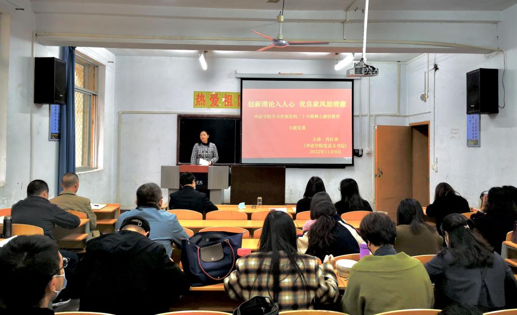 为认真学习贯彻党的二十大精神,落实“351”廉洁教育精品工程要求,进一步强化广大教职工,特别是党员干部传承优良家风,让社会主义核心价值观和中华传统文化人脑入心,更好地营造廉洁从教的良好氛围,促进事业高质量发展。11月9日,yL23411永利官网登录党总支书记肖红香在6108教室为yL23411永利官网登录党员、全院教职工上了一堂主题为“创新理论入人心,优良家风助清廉”的生动党课。