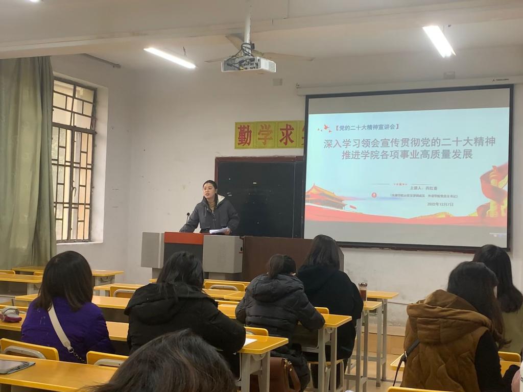 会上,肖红香从大会主要议程、大会主题、主要成果、过去5年的工作和新时代10年的伟大变革、全面建设社会主义现代化国家的目标任务、切实推动党的二十大精神在校园落地生根,推进学院事业高质量发展等六个方面,展开宣讲、全面系统解读了党的二十大精神。