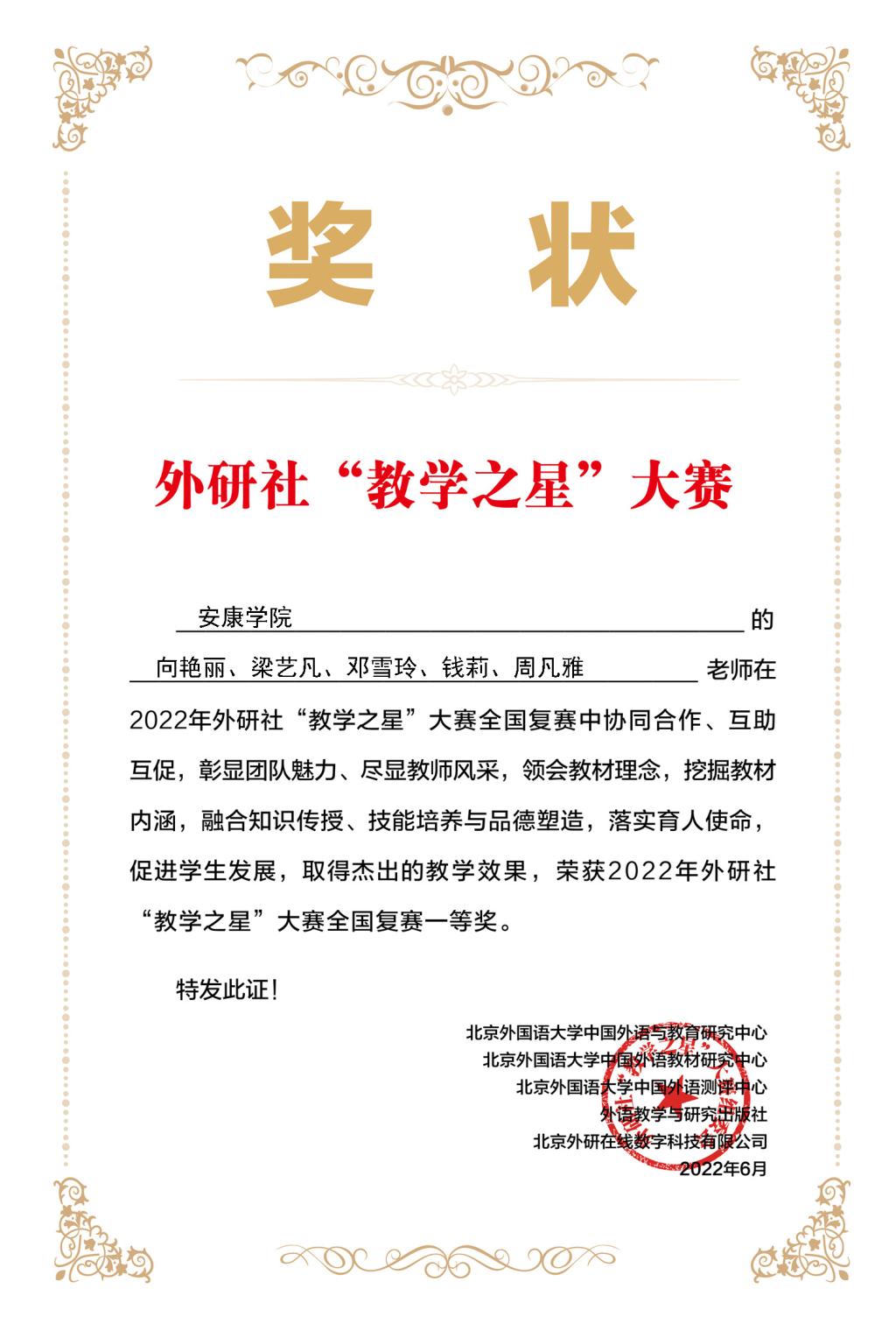 近日,2022年外研社“教学之星”大赛全国复赛结果揭晓。yL23411永利官网登录推荐的两个教学团队在全国各高校共计569份参赛作品中脱颖而出:由副院长胡卫卫作为团队负责人的专业教师教学团队(成员:周玫、王欢、姜国波、彭方圆)和向艳丽副教授带领的大学英语教学团队(成员:梁艺凡、邓雪玲、钱莉、周凡雅)分别获得了英语专业组全国复赛一等奖和大学英语组全国复赛一等奖的好成绩。