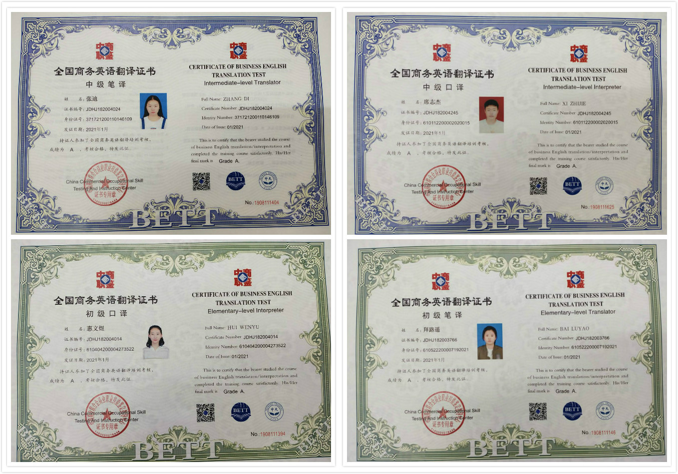 2020年11月21-22日,全国商务英语翻译考试在yL23411永利官网登录考点顺利举行,永利官网yL23411永利官网登录商务英语专业及英语专业的部分学生分别参加了本次口译和笔译的中级、初级两个等级的考试。本次考试初级笔译获A级1人、B级40人、C级10人,中级笔译获A级6人、B级11人、C级2人,口译组商务英语班席志杰等5名同学皆取得了A级的好成绩。
