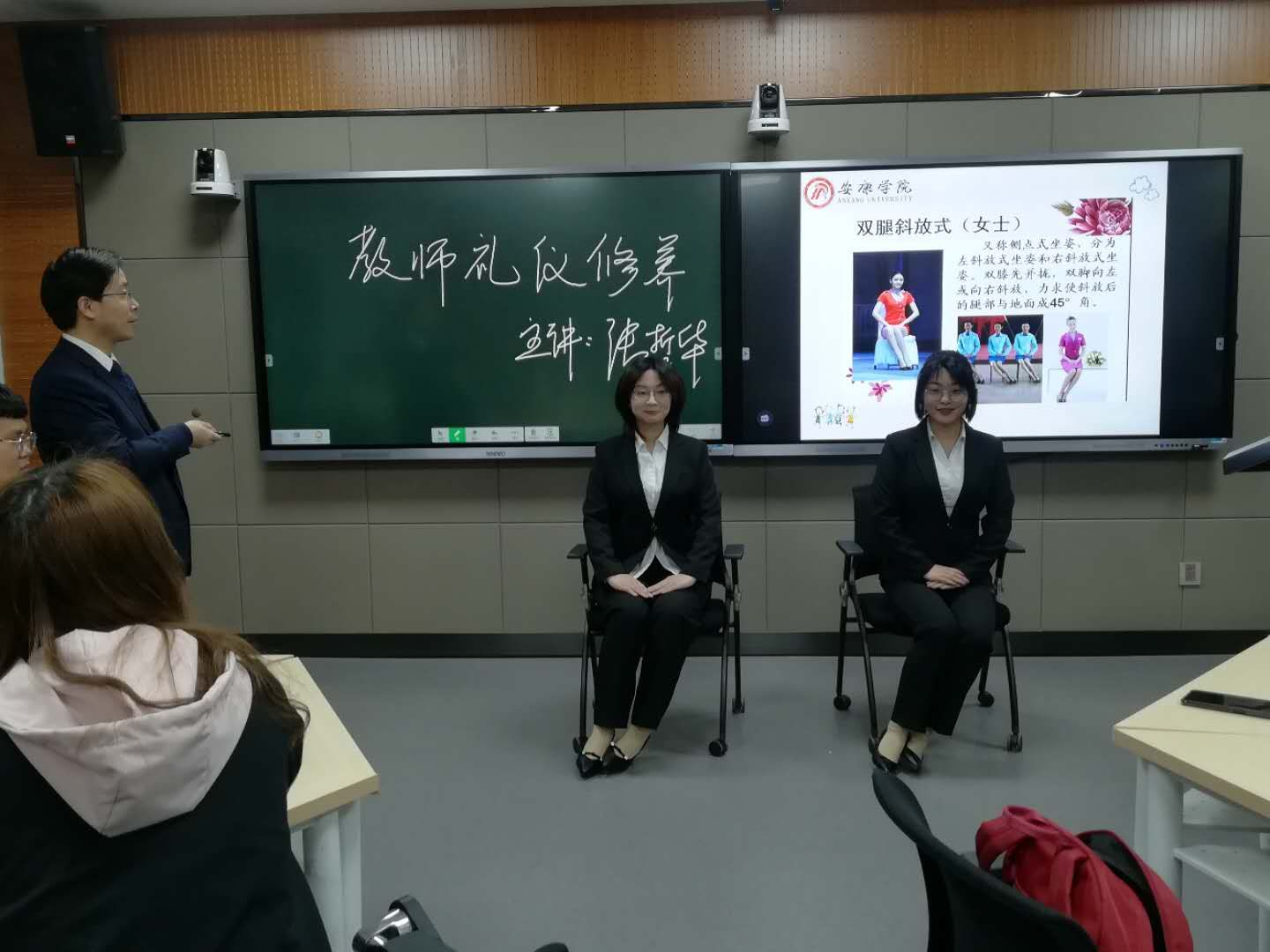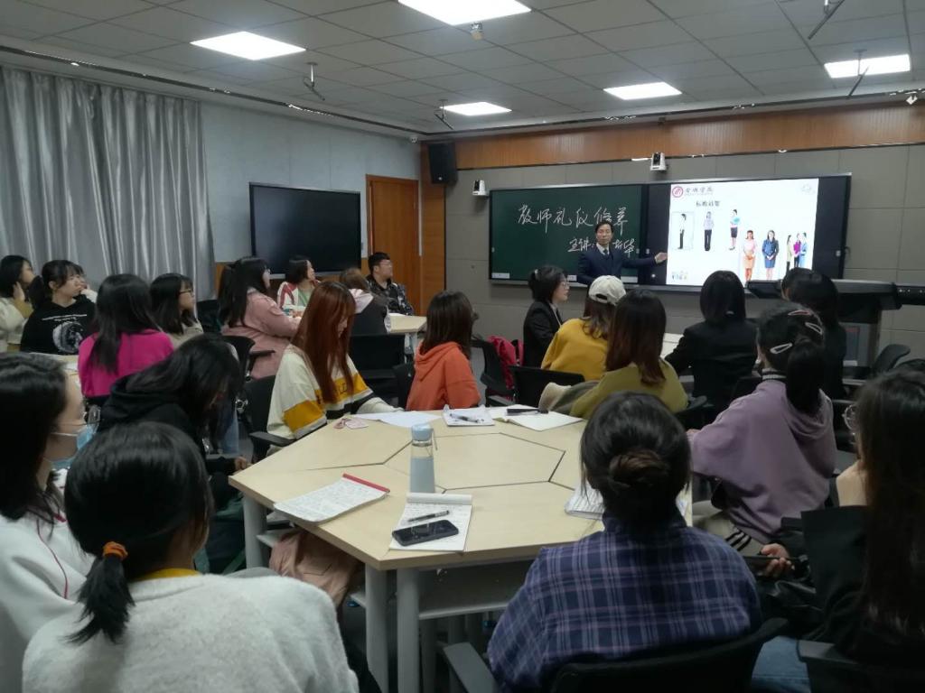 张老师结合当代中小学教师的特质,以“什么是教师礼仪修养以及如何培养教师正确的礼仪习惯”为主题展开多方面深入浅出的讲解。在讲授过程中,全场气氛活跃,张老师为同学们讲解了礼仪示范动作中需注意的要点并邀请学生代表进行现场标准教师礼仪动作演练,还就教师职业礼仪与为人师表之间的关系等问题进行提问,用轻松幽默的语言和现场同学进行良好互动,赢得了同学们的好评。