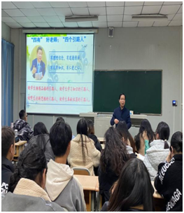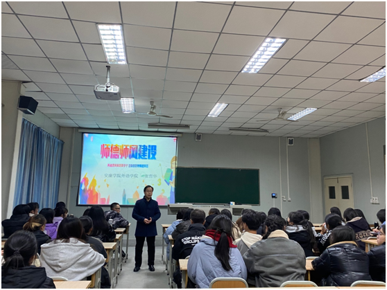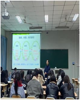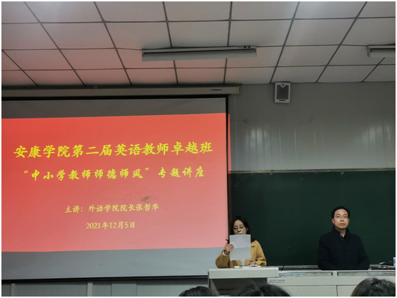 张哲华院长从教师师德师风的解读、违反教师师德师风的现象及根源、师德相关法律法规以及英语师范生教师职业规划四方面进行了详细深入的讲解。“学高为师,德高为范”、“教育之根味苦,教育之果甘甜”,张院长指出,在在新的时代条件下,身为师范生,我们要紧跟习总书记号召,坚定理想信念,培养道德情操,练就扎实本领,心怀仁爱之心,争做“四有”好老师,做好学生的“四个引路人”;强调英语师范生要树立优秀的师德,做到爱岗敬业,教书育人,为人师表。