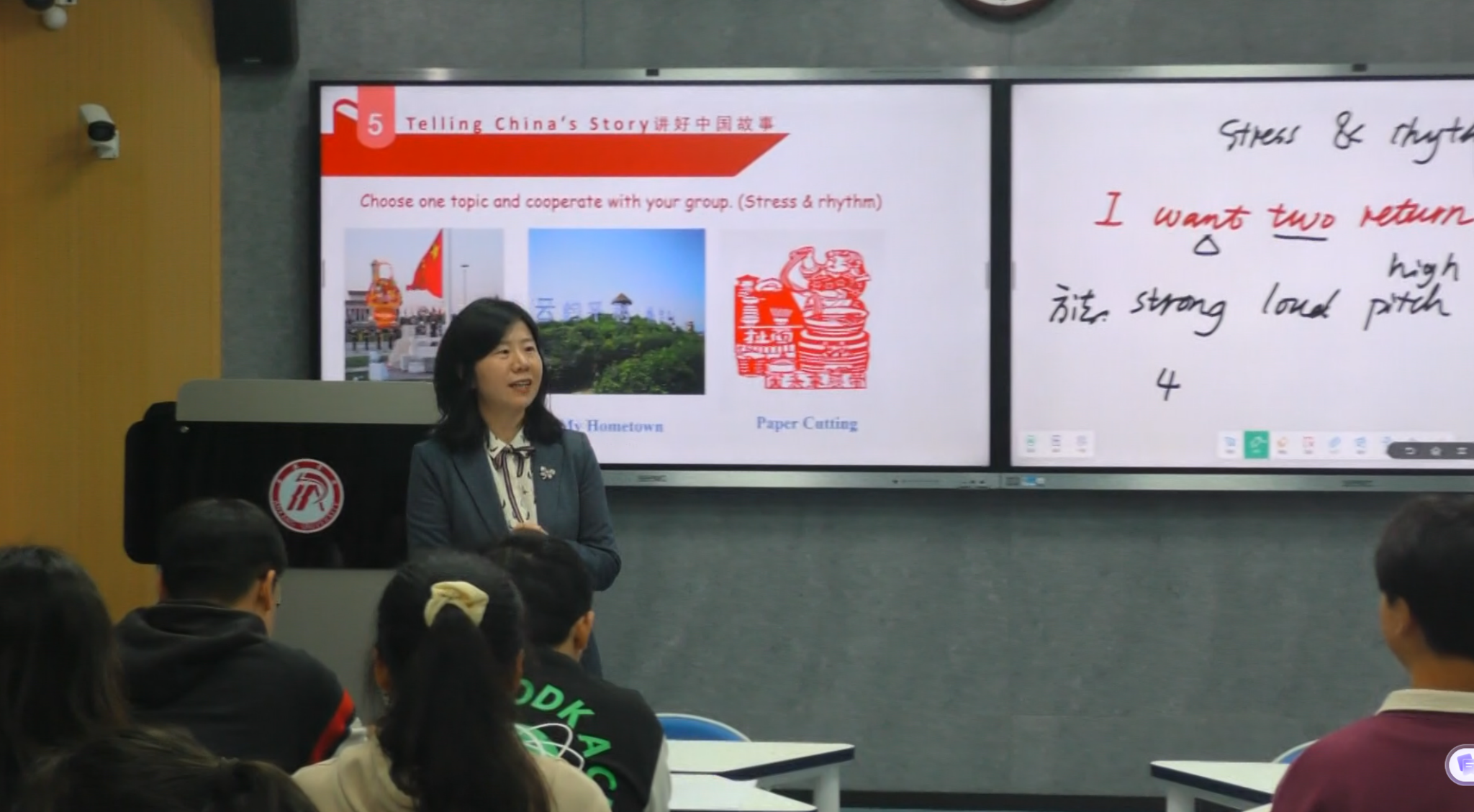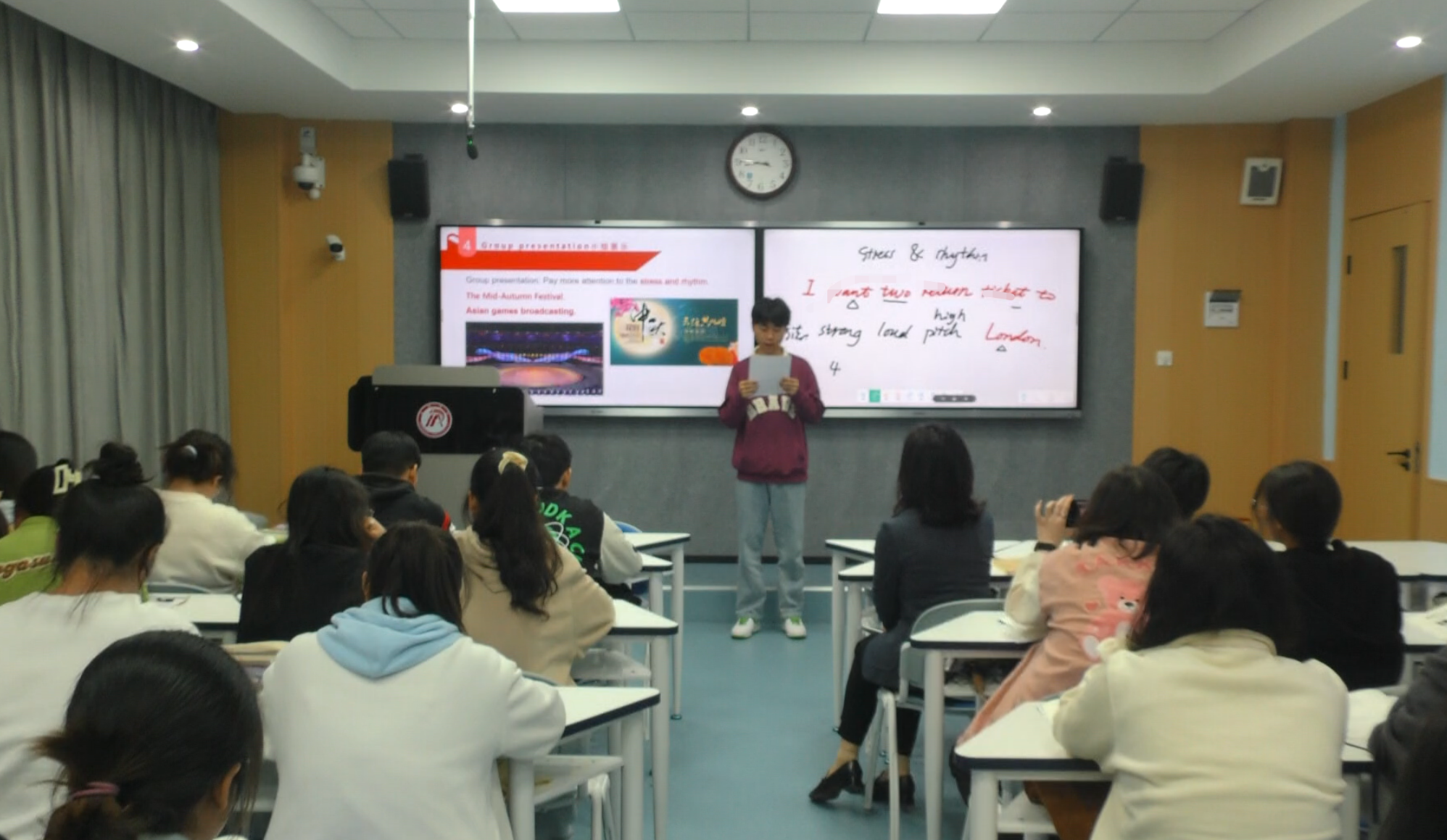 课堂气氛轻松活跃,讨论热烈。学生不仅对视频中重读、语调进行了案例分析,并积极模仿训练标准的语调和重读技巧。在讨论环节,学员们表示,承担培育新一代青少年,不仅要做好专业知识教学,更要结合英语专业特色实现育人目标。