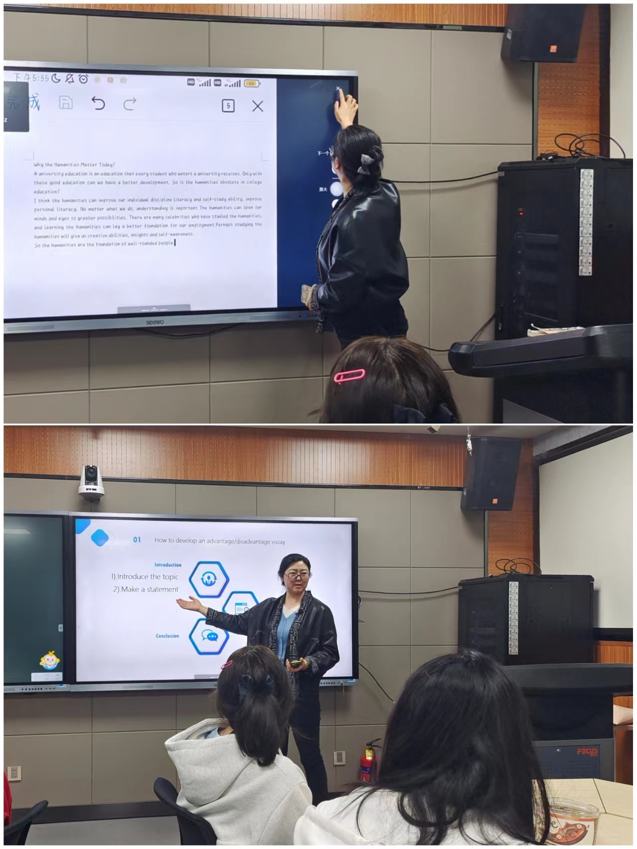 本次教学创新观摩主讲人为青年教师周凡雅,授课单元为新视野大学英语读写教程第二册第二单元“The Humanities:Out of Date?”。课堂以mini辩论开始,引导同学们深入思考人文学科学习在当今时代的价值和意义。接着通过问题的回答,使学生了解文章大意和写作特点,介绍利弊法(advantage and disadvantage)发展议论文段落写作方法。最后通过练习利弊法议论文写作,使同学们了解和掌握ascending order和descending order区别用法,对学生习作开展师生互评。整节课重点难点突出,目标明确,讲解清晰,师生互动充分,教学效果好,达成了教学目标。