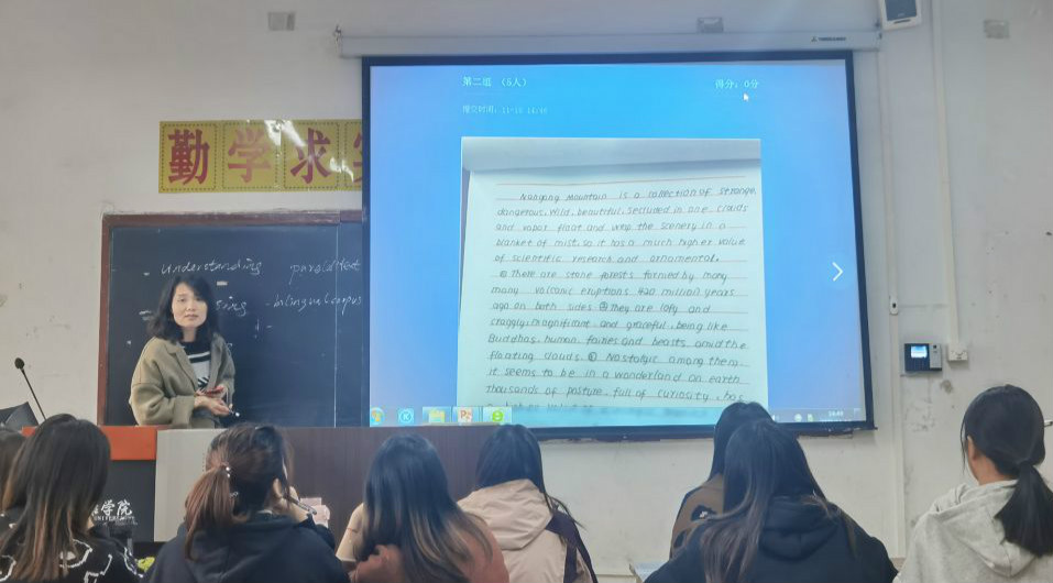 商务英语系教师焦育玲以《旅游景点翻译——以<南宫山>景点宣传为例》展示了《商务翻译》课程的教学过程。课堂上以学生中心,以产出为导向,积极贯穿课程思政理念,运用现代教育技术,创新地将平行语料库引入到翻译课堂上,让学生能够更加直观和深刻的理解旅游文本翻译中常用的方法和翻译过程。