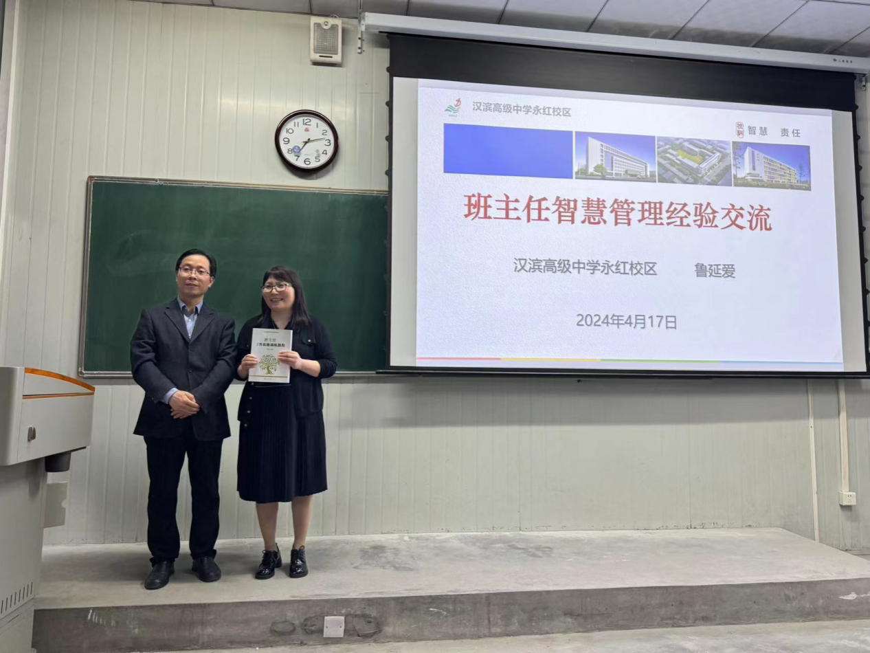为深入推进英语专业双师课程建设,助力师范生综合育人能力提升,4月17日晚,在1027教室,汉滨高级中学永红校区优秀班主任鲁延爱应邀为英语2021级师范生讲授班级智慧管理方法和策略。双师课负责人yL23411永利官网登录院长张哲华,班主任技能训练课程主讲教师王欢,新进教师王小蝶,吕艾桁一同听课。课前,张哲华对鲁延爱老师做了简要介绍,并将他编写的《班主任工作技能训练教程》赠与鲁老师。