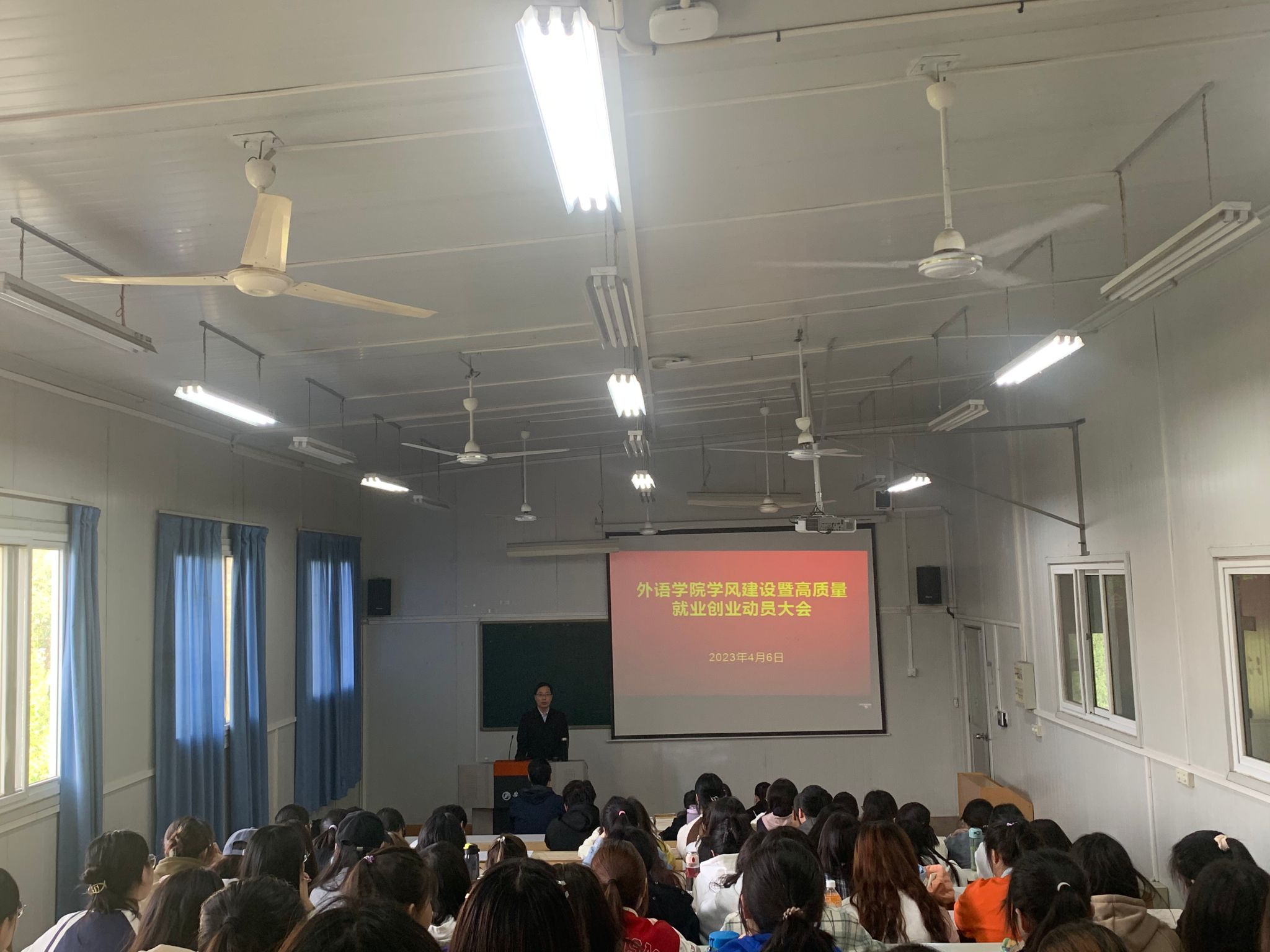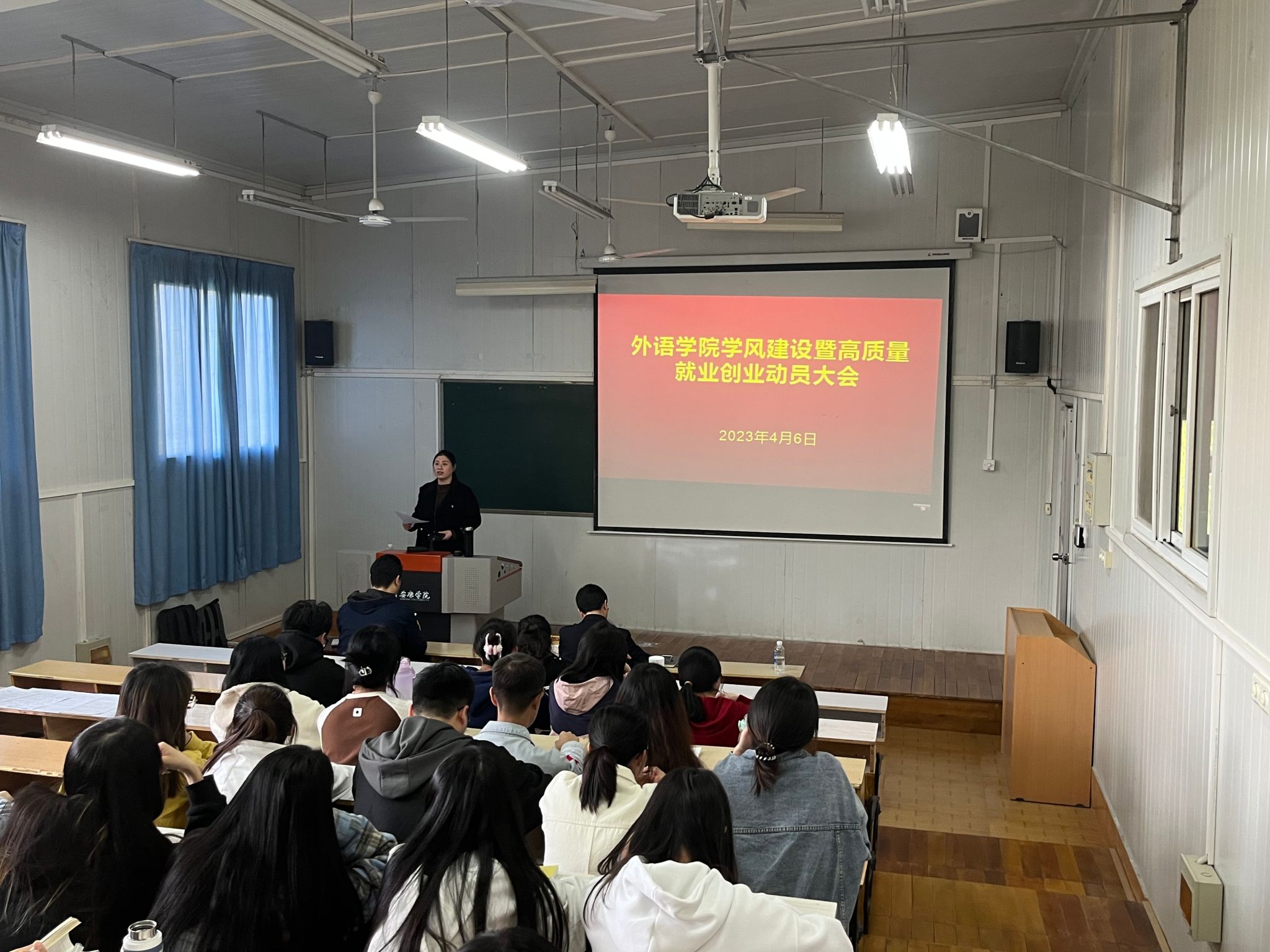 肖红香围绕党和国家关于就业创业的重要指导意见、学院就业创业的具体措施和效果、2023届毕业生就业生就业形势和考研形势分析、学院近年来的考研情况、国家基层就业项目五个方面展开分析。并从胸怀梦想,坚定信念,勇于实践;静心学习,甘于吃苦,练就本领;肩负责任,全面发展,开创未来等三个方面对同学们进一步加强学习,明确目标,做好职业规划做了详细的指导。
