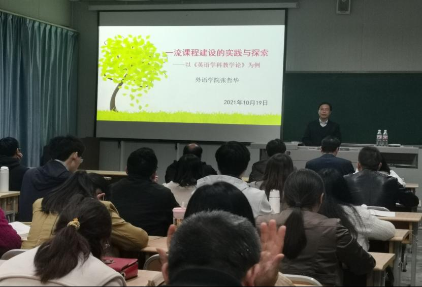 张哲华以陕西省线上一流课程《英语学科教学论》为例,全面介绍了该课程的历史沿革、教学改革历程以及课程建设的经验与成效。同时,还就慕课建设经验做了分享。在讲座中,张哲华特别强调,一流课程建设必须注重课程选择、教学团队搭建、教学改革、教学资源建设等,他指出,作为高校教师,做好一流课程建设,服务应用型人才培养,要不怕麻烦、不怕吃苦、不怕失败,努力钻研,形成成果。