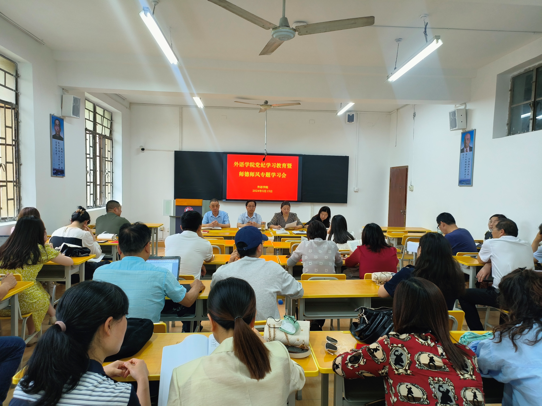 5月15日下午,永利官网召开党纪学习教育暨师德师风专题学习会,深入贯彻落实《关于全面深化新时代教师队伍建设改革的意见》《关于加强新时代高校教师队伍建设改革的指导意见》和陕西省委教育工委 陕西省教育厅《关于弘扬教育家精神 引领高素质教师队伍建设的指导意见》等文件精神,切实推进永利官网教师思想政治工作和师德师风建设工作。学院领导班子,各党支部书记、全体党员、全院教职工参加了会议。
