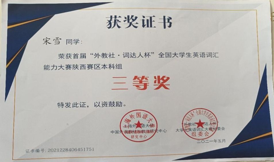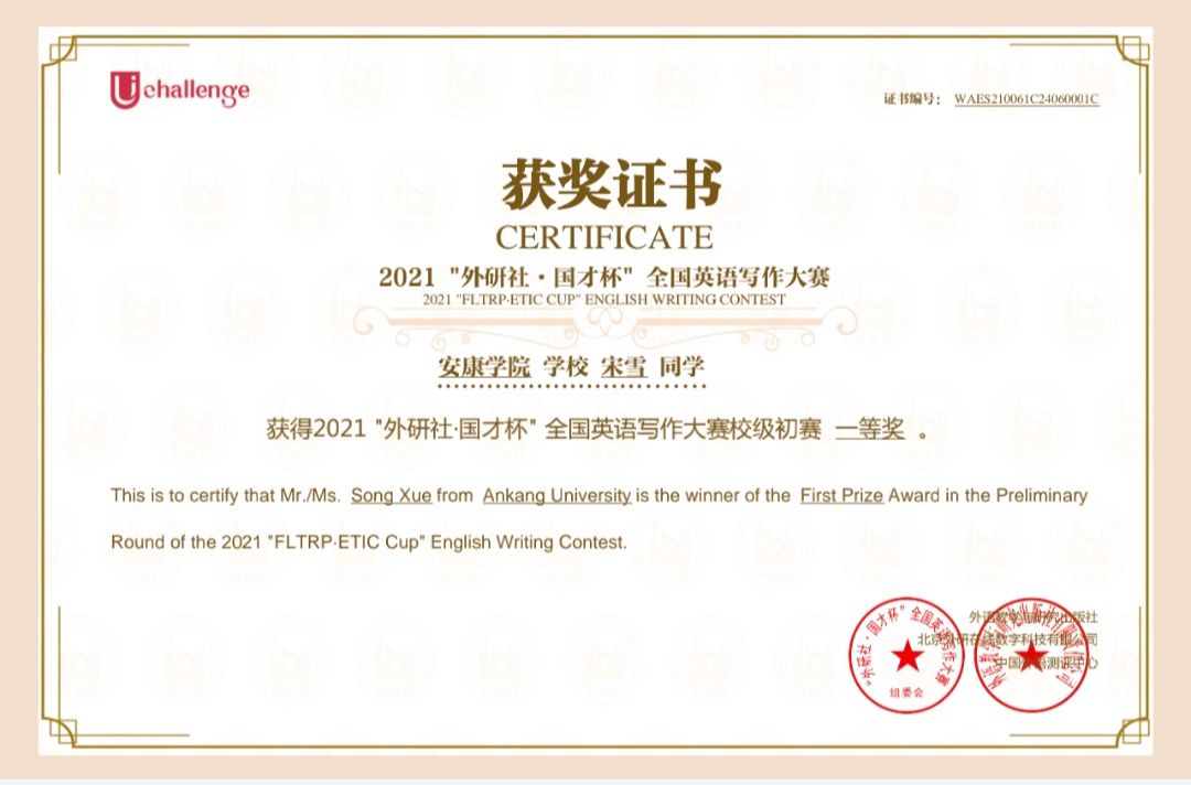 在专业能力培养方面,我顺利通过大学英语四、六级考试及英语专业四级考试,并取得全国商务英语翻译中级笔译证书。当然,我也参加了各类专业比赛,例如,曾获得“中语智汇杯”全国高校商务谈判大赛陕西省三等奖,“外教社·词达人杯”大赛陕西省本科组三等奖,“亿学·新东方乐词杯”省一等奖,“外研社·国才杯”全国英语写作及阅读大赛校赛一等奖,曾获得过学院单项奖励金等。