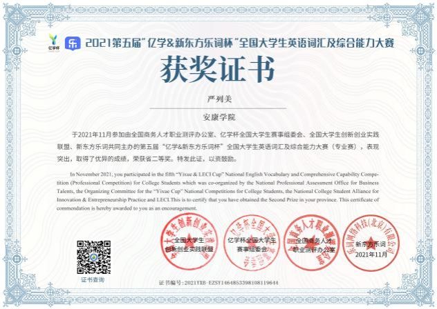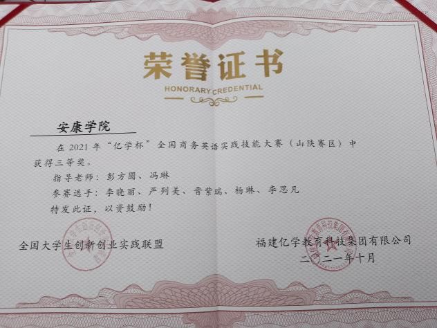 在大学期间,我始终以提高自身的综合素质为目标,以自我的全面发展为努力方向,树立正确的人生观、价值观和世界观。在校期间曾获得过校三好,校优干的荣誉,毕业时也很荣幸获得校优毕。为了丰富校园生活,我参加学院举办的话剧表演比赛,商务营销比赛,参加学校举办的双百杯创意营销大赛(获得校级优秀奖),参与图书馆举办的征文比赛(获得三等奖),参与举办学校迎新晚会等。为适应社会发展的需求,我参与校学生会工作,做过微商,打过各种暑假工,与各种形形色色的人接触交流,发挥自我的特长,挖掘自身的潜力,逐步提高自我的学习本事和分析处理问题的本事。为了培养专业能力,我参加各种专业比赛,获得“外研社•词达人”大赛陕西省区本科组一等奖,“亿学杯”全国商务英语实践技能大赛(山陕赛区)三等奖,"亿学&新东方乐词杯”全国大学生英语词汇及综合能力大赛获省二等奖等。